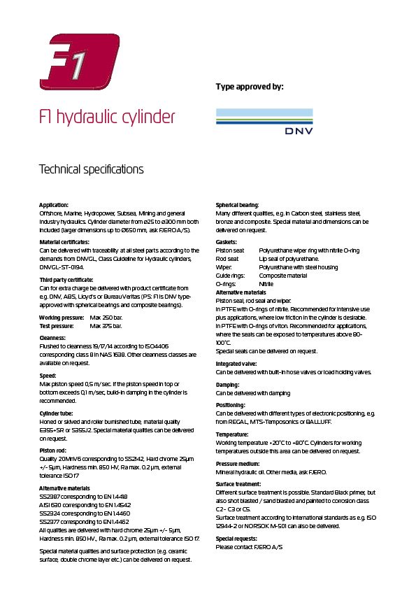 Besides DNV.GL type approval, FJERO’s F1 cylinders can also be supplied with material certificates and pressure test certificates. The F1 cylinder is also offered with other third-party approvals, for example ABS, Lloyd’s, Bureau Veritas, RINA, CCS and many others.